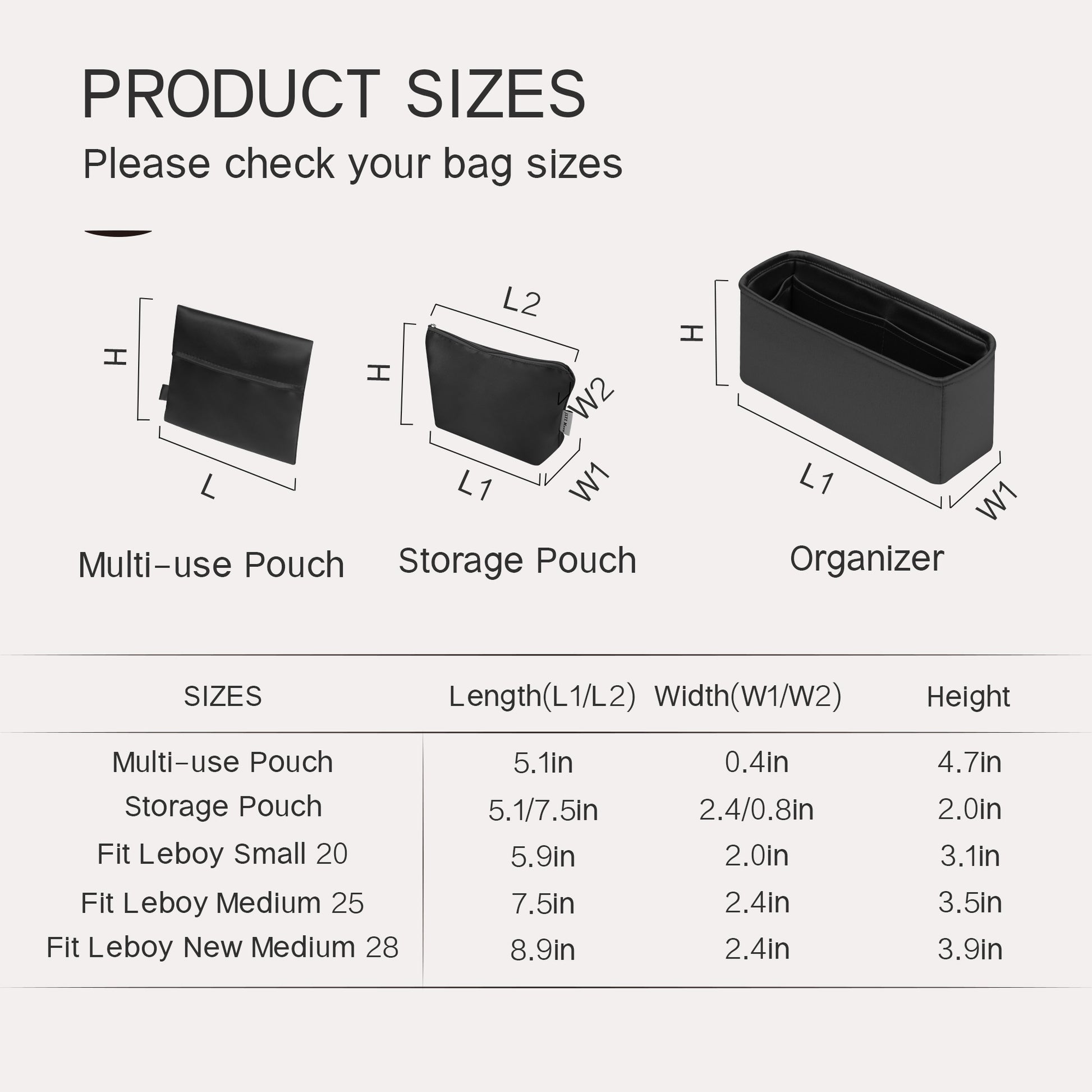 To find your perfect fit, we strongly recommend: Consulting the detailed size chart on each product page and comparing it with your bags.