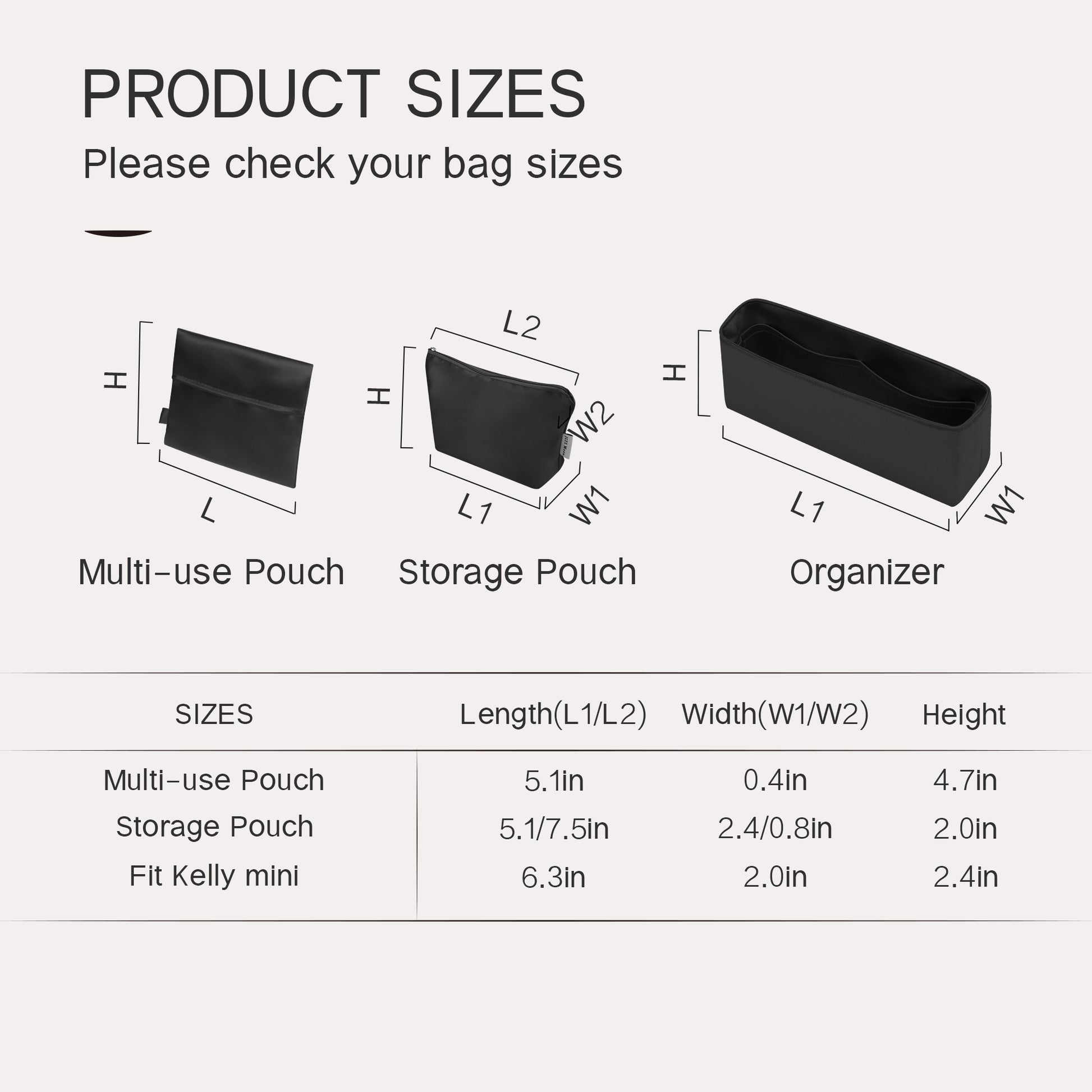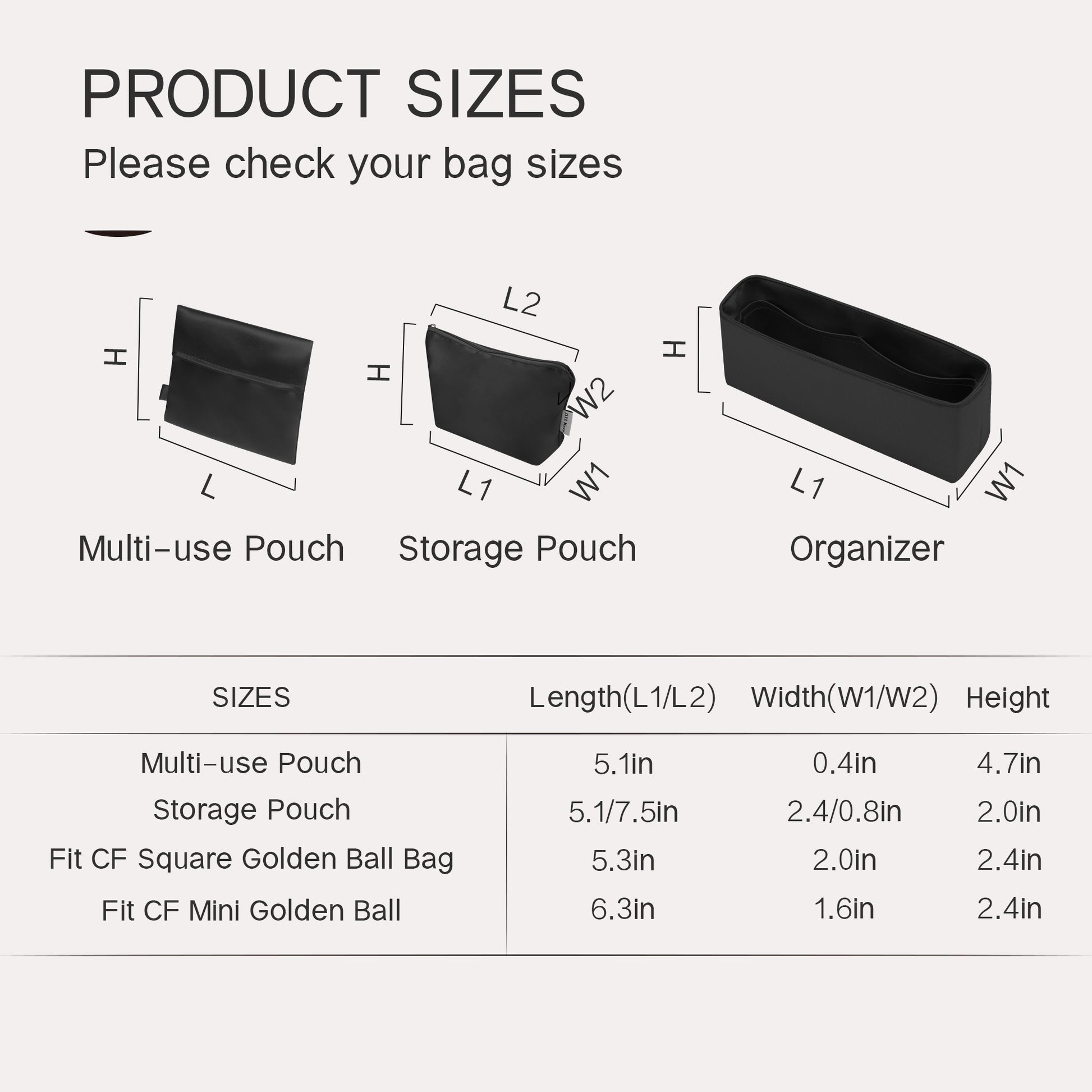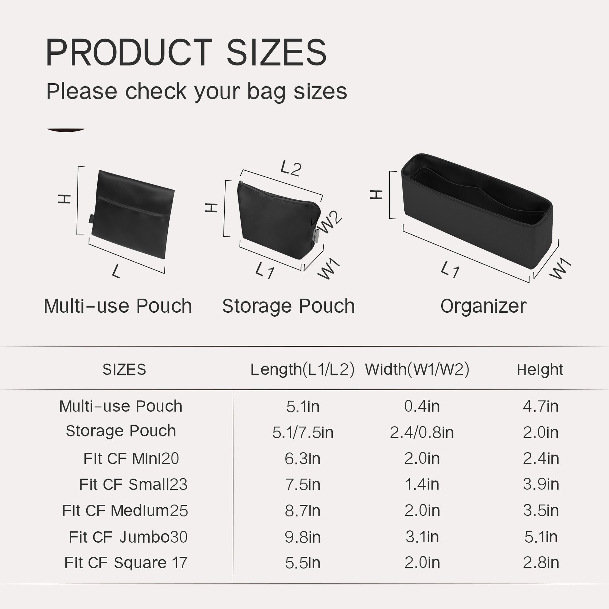 To find your perfect fit, we strongly recommend: Consulting the detailed size chart on each product page and comparing it with your bags.